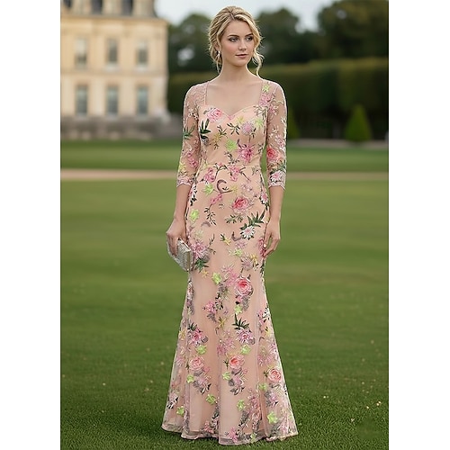 Sirena Tromba Tubino Colonna Lunghezza al pavimento Abito da Sera Elegante Floreale Manica 3/4 Scollo a Cuore Festa serale Festa in giardino Pizzo Tulle con Fiore ricamato Fiori 3D Ricamo