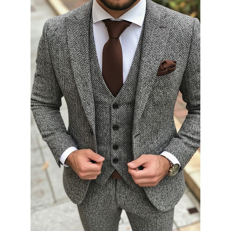 Men's Wedding Business Tweed Suits Peaked Lapel Black Grey Formal Herringbone Tailored Fit 3 Piece Single Breasted One-button