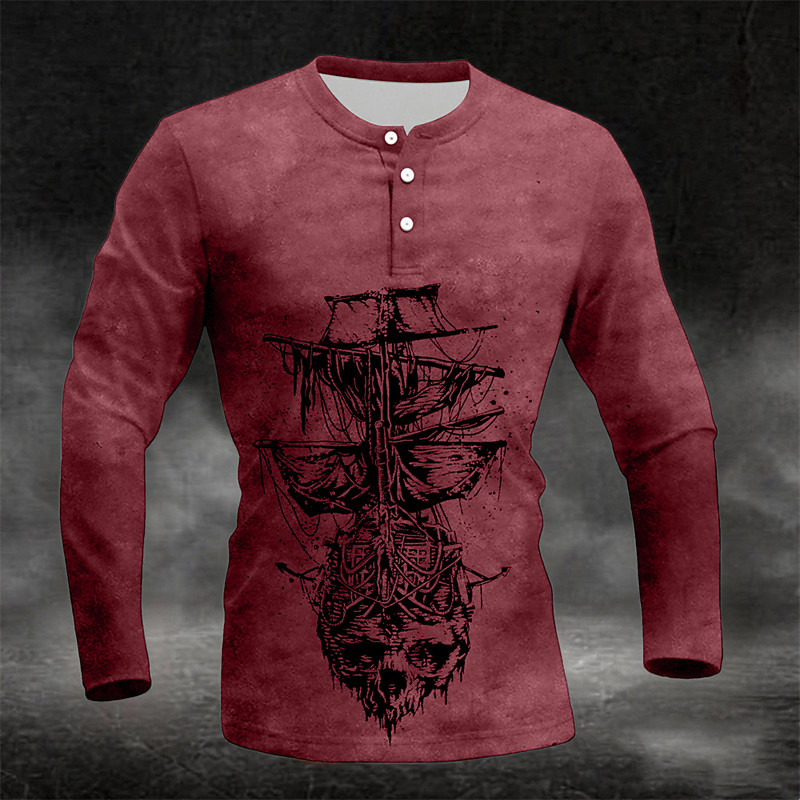 Men's Graphic Vintage Sailboat Henley Shirt Long Sleeve Fashion Cute Daily Casual Holiday Going out Spring Fall Dark Grey Blue Green Burgundy Purple Henley Henley T-Shirt