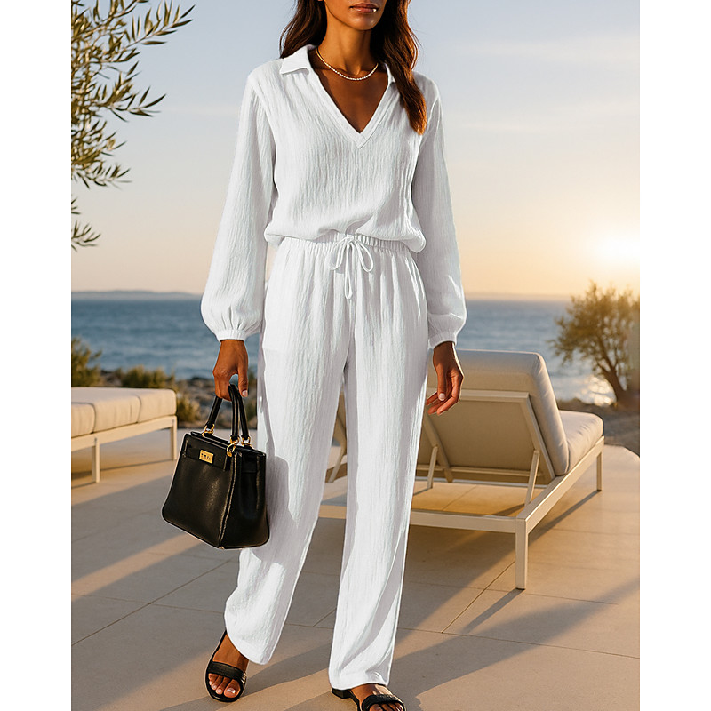 Women's Fashion Streetwear Shirt Linen-Inspired Sets Two Piece Sets Long Sleeve Shirt Collar Solid Color Daily Wear Date Black White Blue Spring Regular Fit