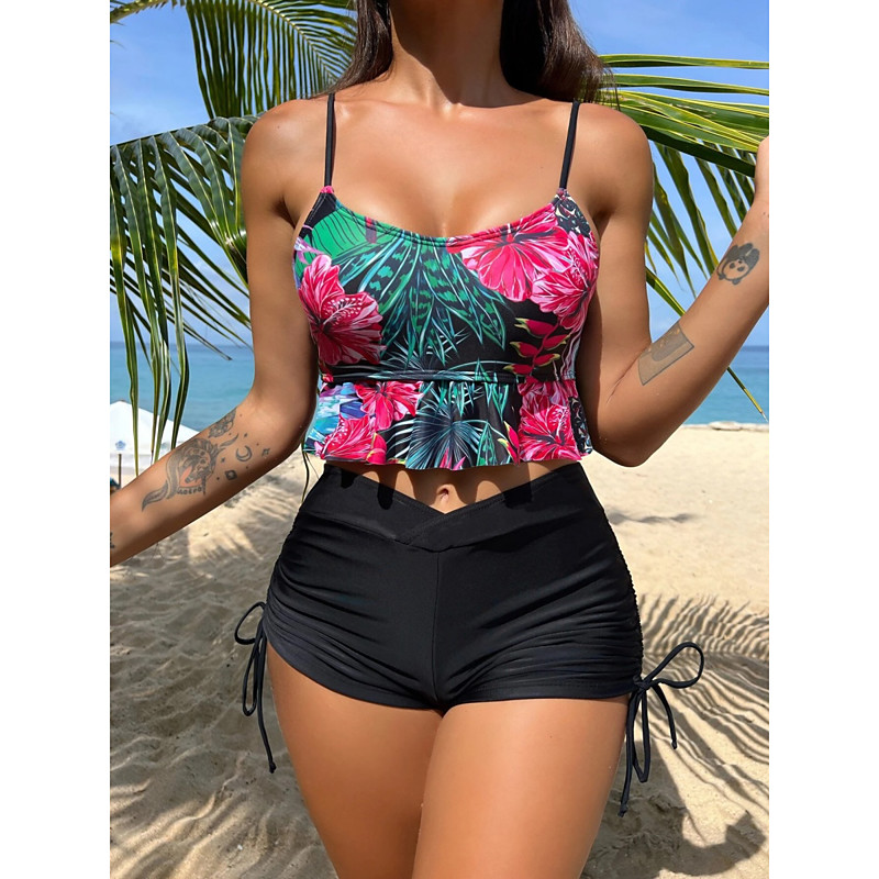 Women's Tankini 2 Piece Swimsuit Ruched Palm Shorts Tummy Control High Waist Slim Backless Vacation Beach Wear Floral Scoop Neck Sleeveless Bathing Suits