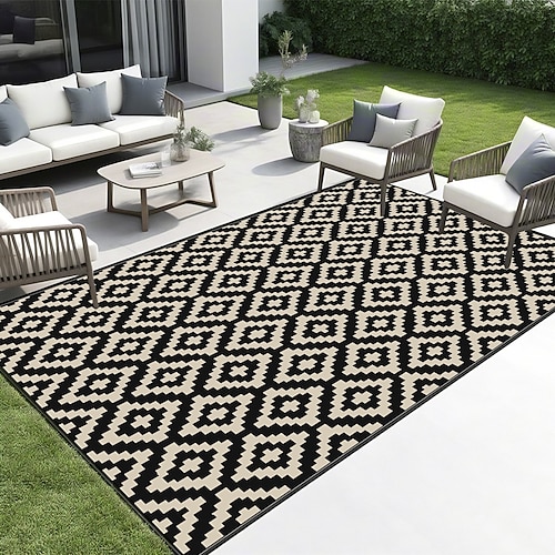 Tappeto da esterno impermeabile 5x8 piedi, tappeto reversibile in plastica, tappeto moderno, grande tappetino per esterni, camper, patio, giardino, terrazzo, picnic, spiaggia, campeggio, nero beige