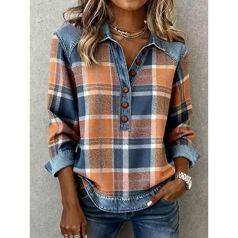 Women's Pullover Plaid Casual Long Sleeve Lapel Regular Tops Orange Spring Fall
