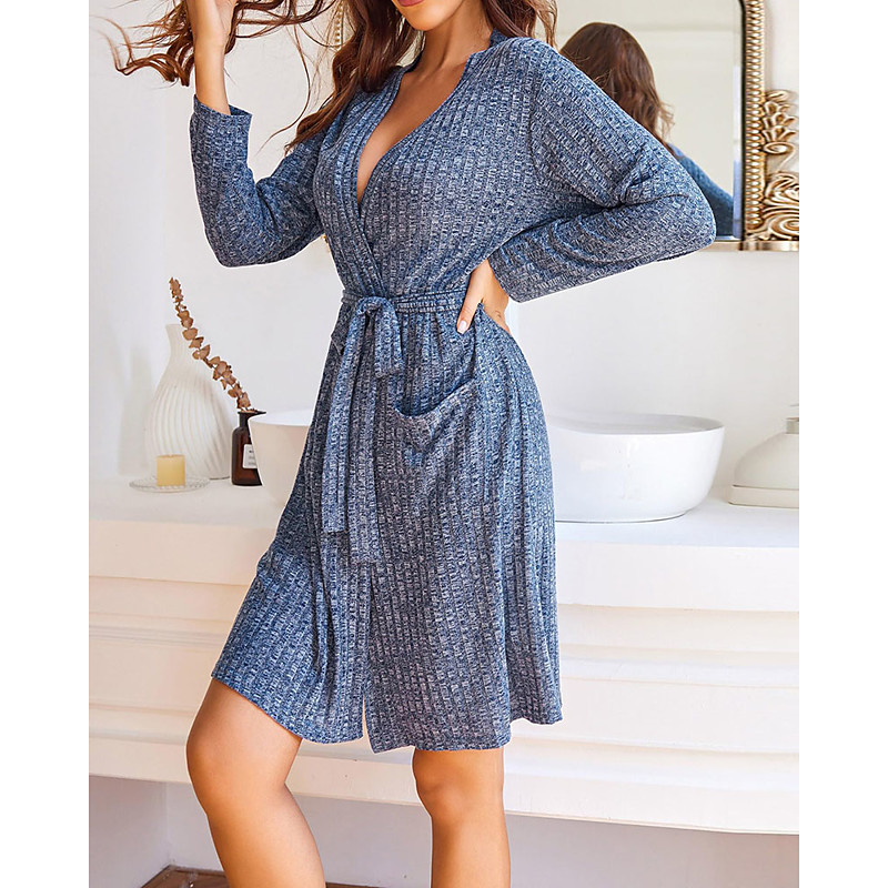 Women's Pajamas Loungewear Nightgown Casual Pure Color Drawstring Pocket Dress Home Daily Long Sleeve V Neck Lake blue Black Gray Fall Winter Tailored Fit