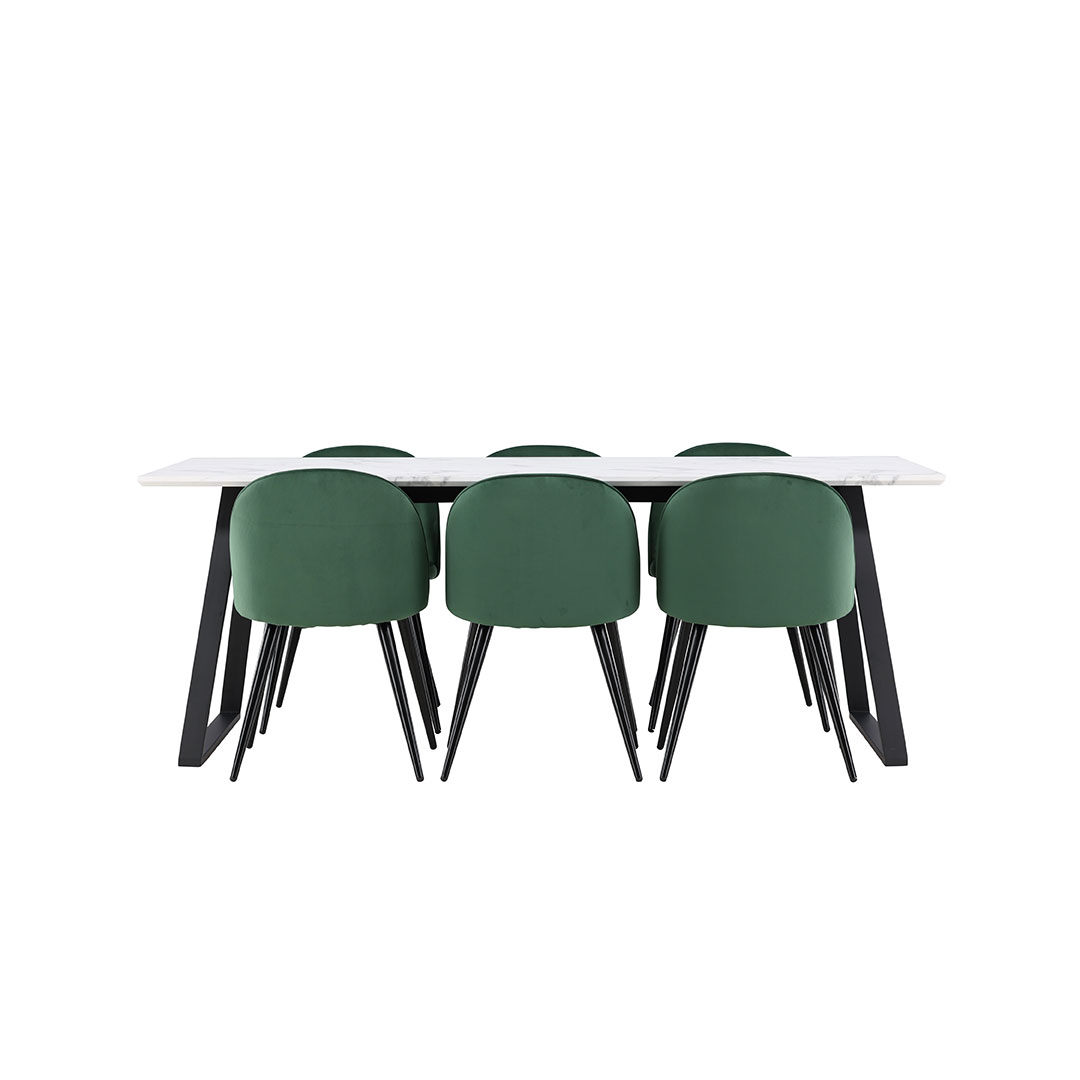 Malaga Essgruppe Esstisch 90x200cm weiß und 6 Skagen Stuhl velour grün.