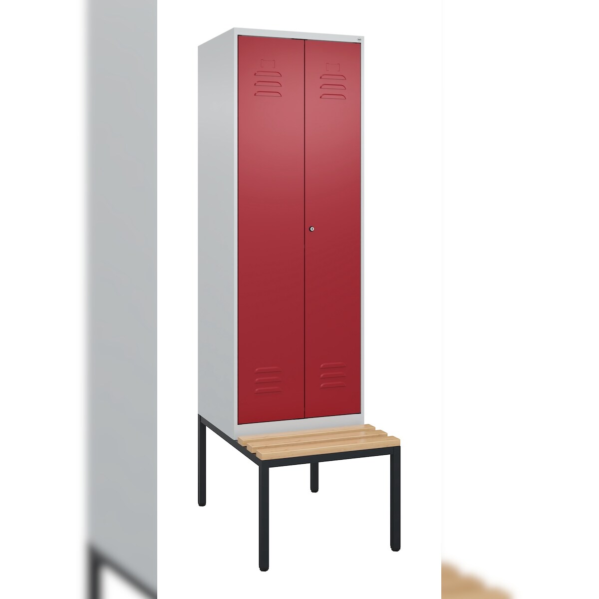 C+P Doppel-Spind Classic PLUS Buche untergebaute Bank 2 Abteile, HxBxT 212x60x82cm, Zylinderschloss, Hellgrau/Rubinrot von PROREGAL