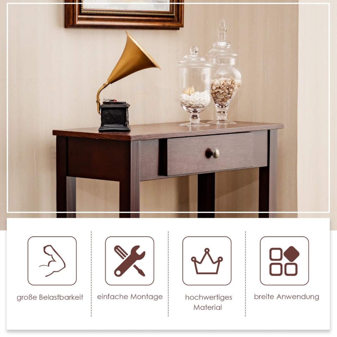Konsollbord med skuff, inngangsbord, smalt industrielt sidebord laget av tre 71 x 30 x 71cm brun