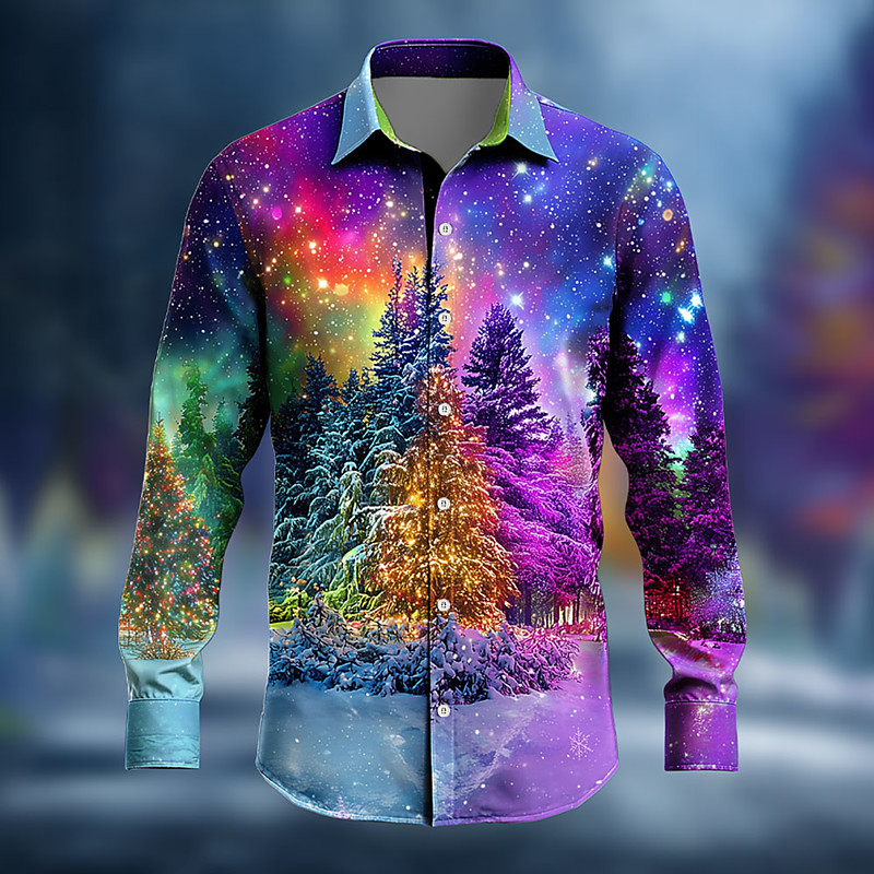 Christmas Men's Christmas Tree Aurora Christmas Costume Shirt Button Up Shirt Long Sleeve Funny Outdoor Holiday Spring Fall Turndown 3D Print Collared Shirts Blue 1# Blue Purple Green Dark Purple