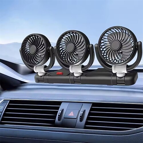 Ventilatore per auto a tre teste, ventilatore di raffreddamento per veicoli a 3 teste alimentato tramite USB da 12 V/24 V per cruscotto, potente e silenzioso circolatore d'aria per auto girevole a