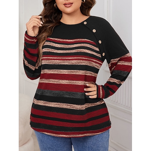 Per donna Taglia grossa Top Blusa A righe Bottoni Stampato Manica Lunga Girocollo Moda Streetwear Casual Quotidiano Weekend Fil di lana Primavera Autunno Nero