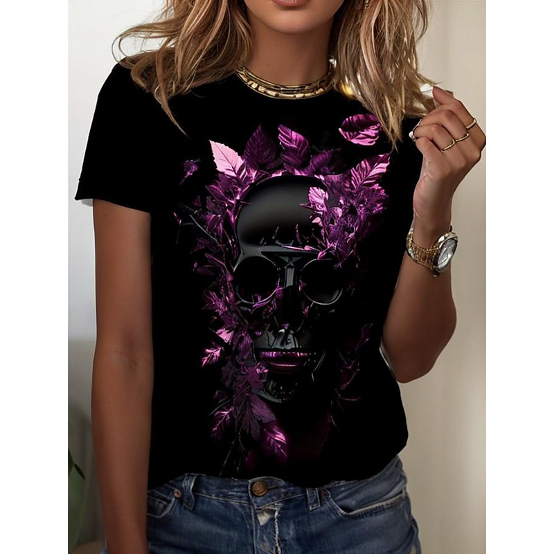 Women's T Shirt Skulls Graphic Skeleton Stylish Casual Short Sleeve Round Neck Regular Tops Daily Weekend Print Black Summer Spring