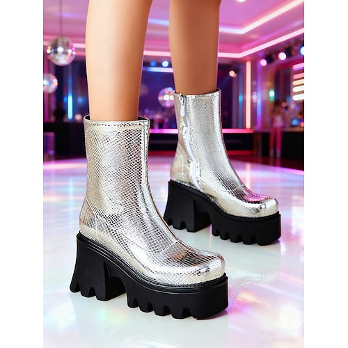 stivali da donna con plateau in metallo argentato, tacchi spessi e cerniera - stile disco anni '80, calzature da festa alla moda per serate fuori e balli