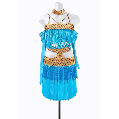 Completo da donna per balli latini con frange e strass blu e oro: corpetto con paillettes ritagliate, gonna con frange, guanti costume da spettacolo con girocollo