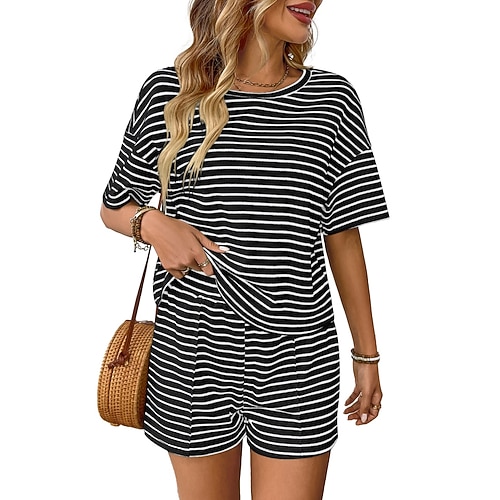 Per donna Set da due pezzi Set di Pantaloncini Manica Corta Girocollo A righe Moda Streetwear Casuale Quotidiano All'aperto Nero Rosa Verde Estate Vestibilità regolare