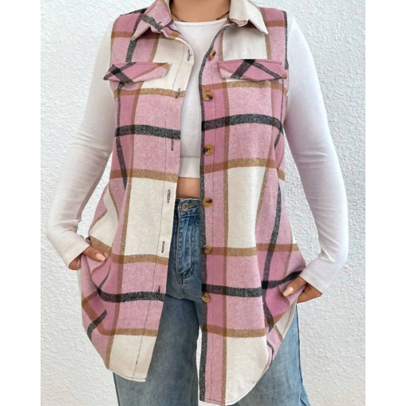 Women's Vest Comfortable Pocket Buttons Casual Plaid Vacation Street Casual Daily Wear Short Turndown Regular Fit Sleeveless Outerwear Pink Wine Orange Fall Winter