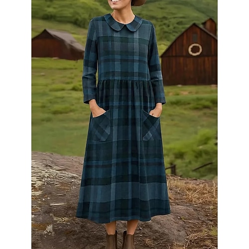 Per donna Abito Midi Tubino Abito Pieghettato Vacanza Casual Boho Ferie Abito Primaverile Vestibilità regolare Plaid Manica Lunga Girocollo Blu Marrone chiaro Marrone Primavera Autunno