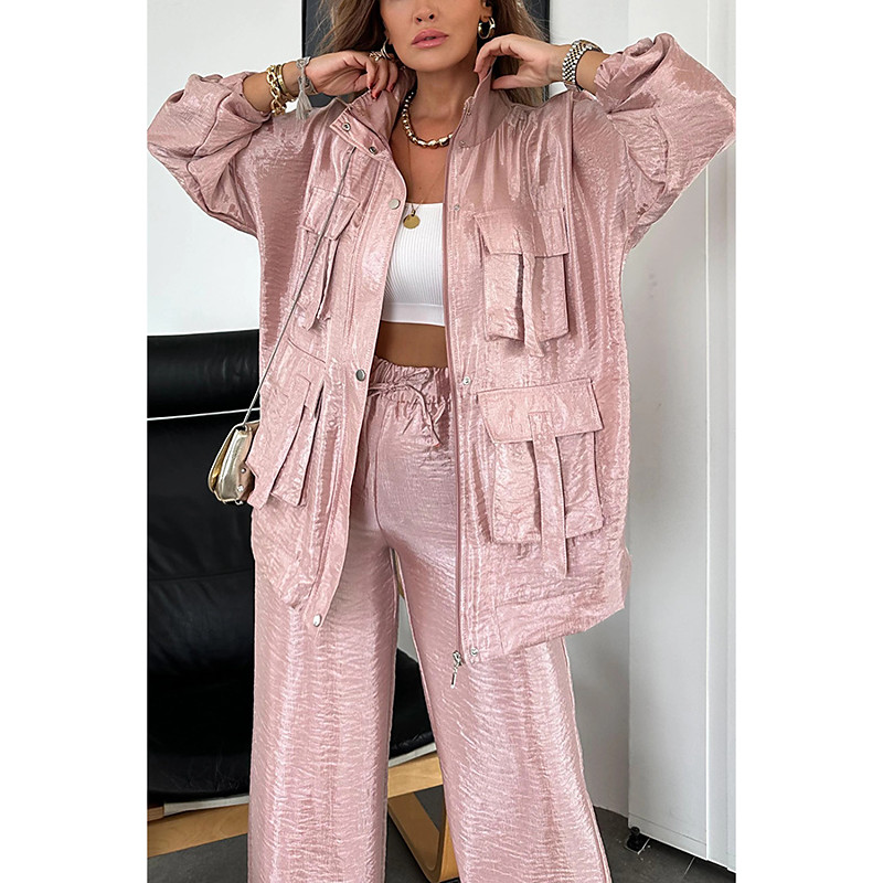 Women's Suits Comfortable Drawstring Pocket Full Zip Sports Fashion Daily Retro Plain School Vacation Home Office Cardigan Regular Stand Collar Loose Fit Long Sleeve Outerwear Silver Lake blue Black