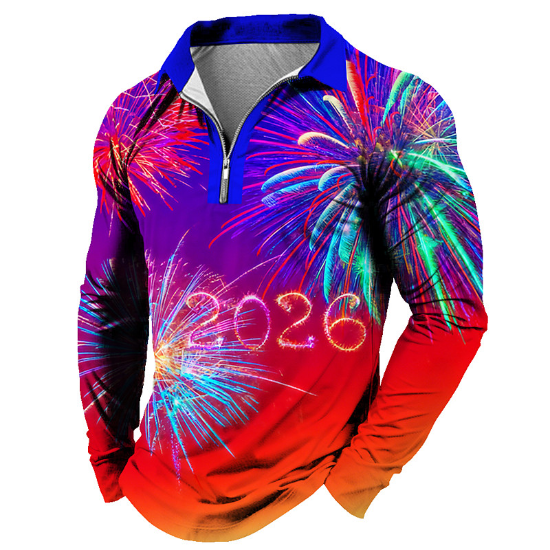 New Year Men's Fireworks Polo Long Sleeve Polo Shirts Lapel Casual Daily Wear Festival Outfit 3D Print Quarter Zip Polo Spring Fall Winter Blue Red Sky Blue