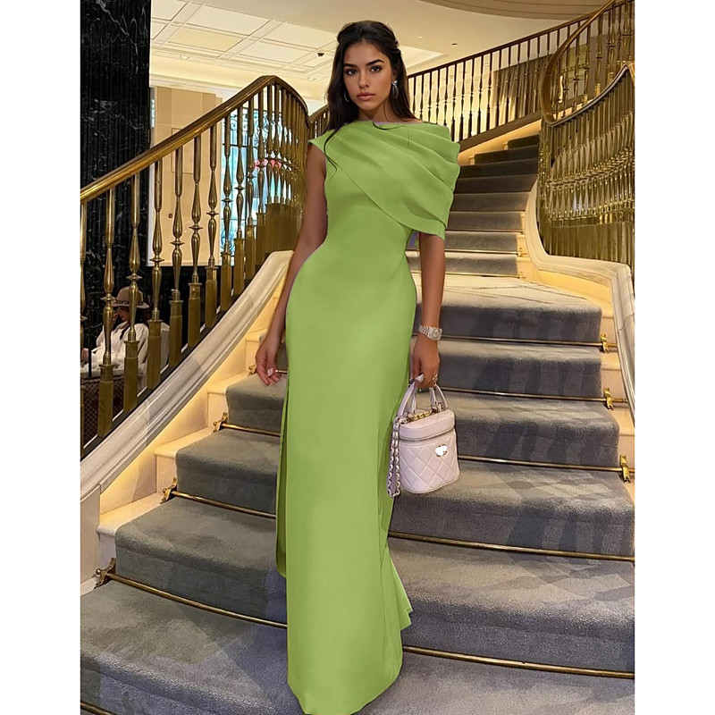 Sheath Column Floor Length Prom Dresses Evening Gown Ball Gown Formal Dress Elegant High Split Side Slit Short Sleeve Crew Neck Formal Stretch Crepe with Ruched Shawl