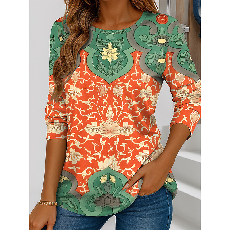 Women's T Shirt Floral Graphic Paisley Vintage Stylish Classic Long Sleeve Crew Neck Regular Tops Daily Print White / Black Black Red Orange Gold Spring Fall Winter