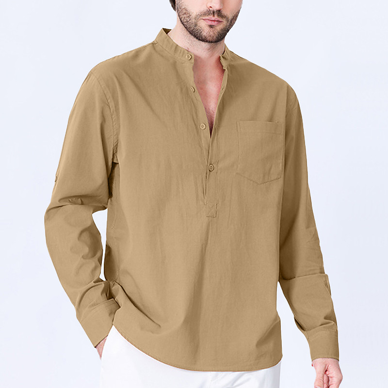 Men's Shirt Band Collar Shirt Popover Shirt Casual Shirt Black Red Green khaki Light Grey Long Sleeve Solid Color Henley Party Going out Front Pocket Clothing Apparel Fashion Sports Outdoors