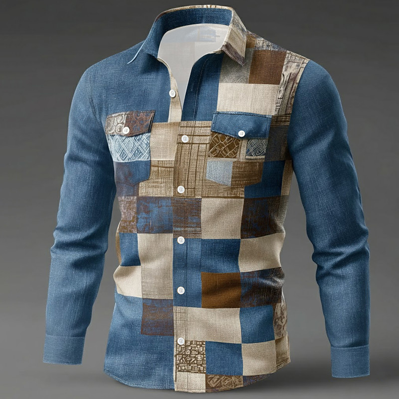 Men's Geometric Color Block Patchwork Shirt Button Up Shirt Long Sleeve Fashion Casual Outdoor Dailywear Spring Fall Turndown Front Two Pockets Linen Like Shirt Blue Brown Green Gray