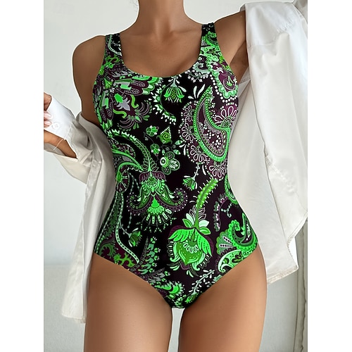 Costume da bagno intero da donna snellente monokini boho alto in vita controllo della pancia schiena scoperta elegante per vacanze paisley colletto a U e senza maniche