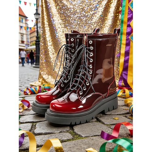 Damen Mardi Gras Blaue Lackleder Kampfstiefel mit Chunky Sohle und Schnürdesign – Kühnes Schuhwerk für Karneval Festivals und legere Ausflüge