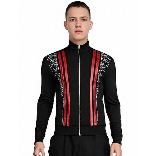 giacca in pile per pattinaggio artistico, giacca da pattinaggio sul ghiaccio per uomo e ragazzo, top nero elastico, abbigliamento da pattinaggio per competizione, termico, caldo, con cristalli/strass,