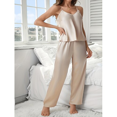Per donna Pigiama Set Pigiama Semplice Casual Colore Puro Pizzo Elastico in vita Pantalone Quotidiano Casa Vacanza Senza Maniche Spalline Nero Rosa Rosso Beige Estate Primavera Vestibilità regolare