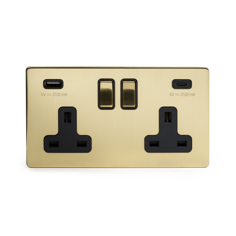 Soho Lighting Brushed Brass 2 Gang USB A+C Socket (13A Socket + 2 USB Ports A+C 3.1A)