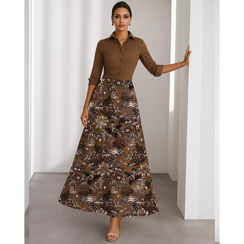 A-Line Floor Length Tea Length Beaded Eembroidered Shirt Dress Party Dress Mother of the Bride Dress 3/4 Length Sleeve Shirt Collar Elegant Sparkle Garden Party Wedding Formal Satin Lace with Beading