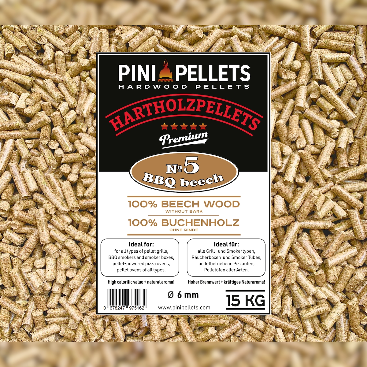 PINI Hartholz Pellets 100% Buche Nr. 5 BBQ Beech 15 Kg Grillpellets zum Grillen Räuchern Smoken