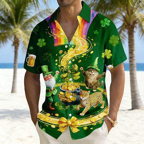 Per uomo Trifoglio folletto Una pentola d'oro Camicia Camicia Estiva Camicia con Bottoni Manica Corta Vintage Retrò Ferie Estate Collo ripiegato Stampa 3D Una tasca anteriore Camicia tipo lino Verde