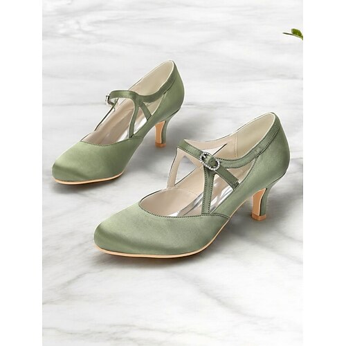 Damen Salbeigrüne Satin T-Strap High Heels-Vintage Gatsby Mittel-Absatz Pumps mit Schnallenverschluss elegante Schuhe für Hochzeiten Balltanz