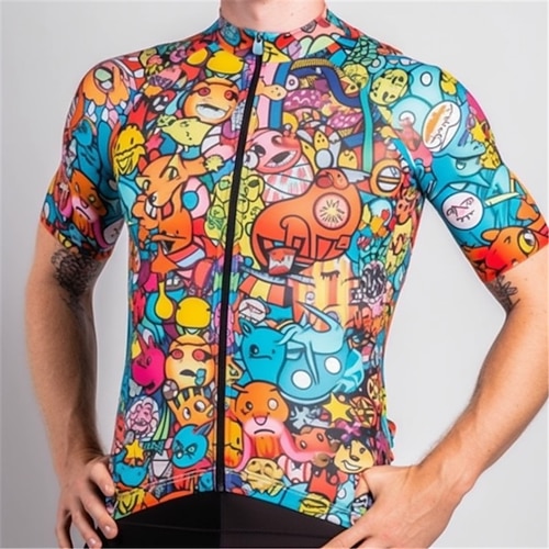 Herren Radtrikot Cartoon Kurzarm Fahhrad T-Shirt Oberteil mit 3 Gesäßtaschen Mountainbike MTB Straßenradsport Schnelltrocknend Frontreißverschluss Feuchtigkeitsableitend Sport Rosa Blau Grün