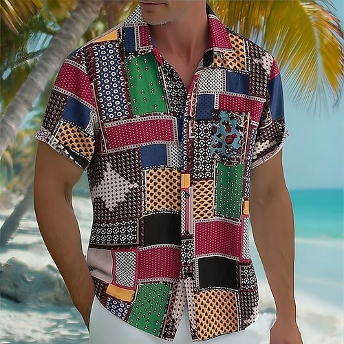 Herren Farbblock Patchwork Boho Hemd Sommerhemd Knopfhemd Kurzarm Vintage-Retro Alltagstauglich Strandurlaub Sommer Umlegekragen 3D-Druck Eine Tasche vorne Leinenähnliches Hemd Rote Grün
