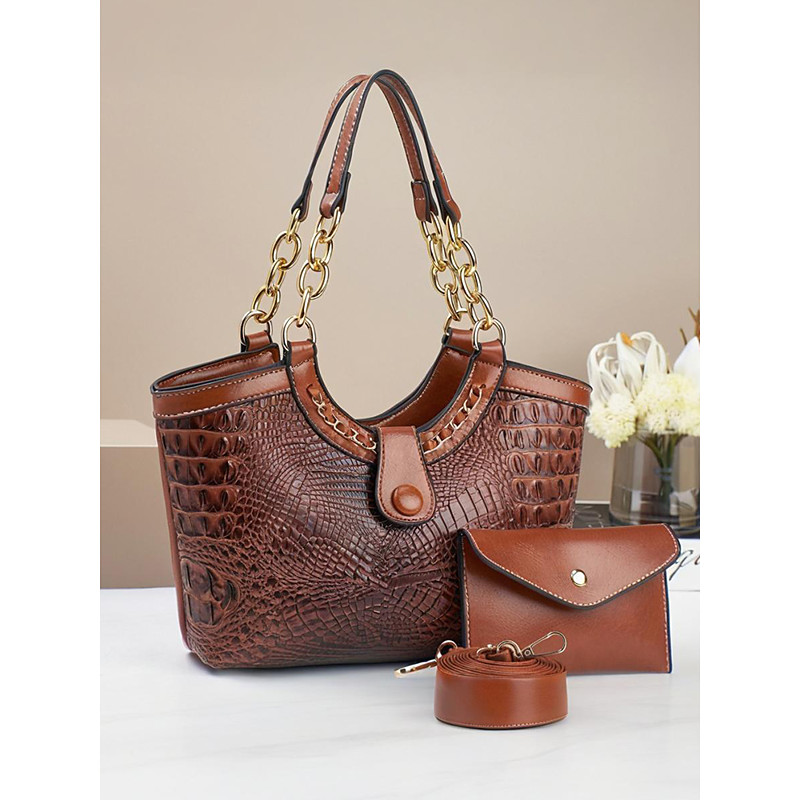 Women's 2-Piece Faux Leather Crocodile Tote Bag Set – Stylish Shoulder Handbag with Chain Detail and Wallet for Work, Travel and Daily Use