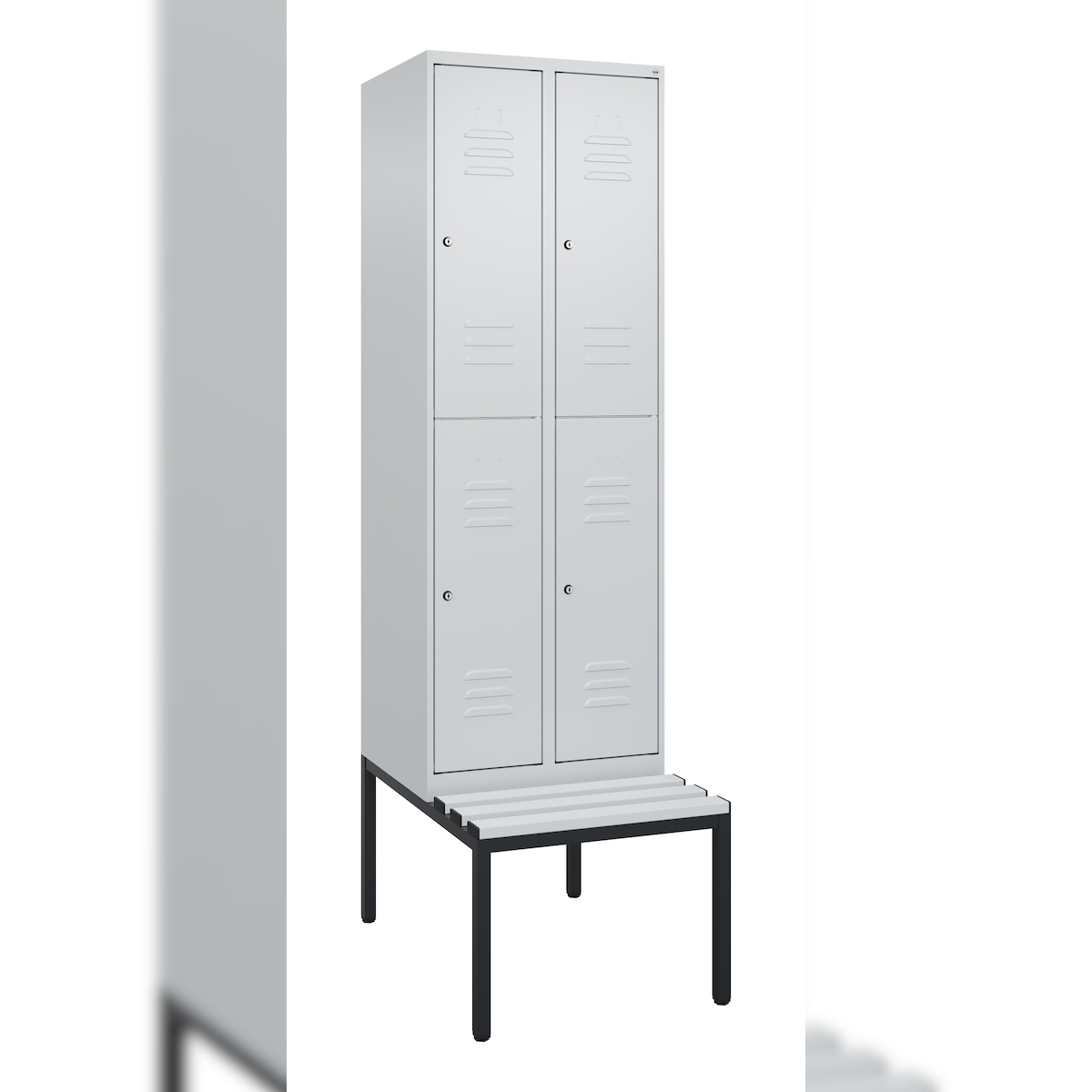 C+P Spind Classic PLUS, Kunststoff untergebaute Sitzbank, 4 Abteile, HxBxT 212x60x82cm, Zylinderschloss, Hellgrau/Hellgrau von PROREGAL