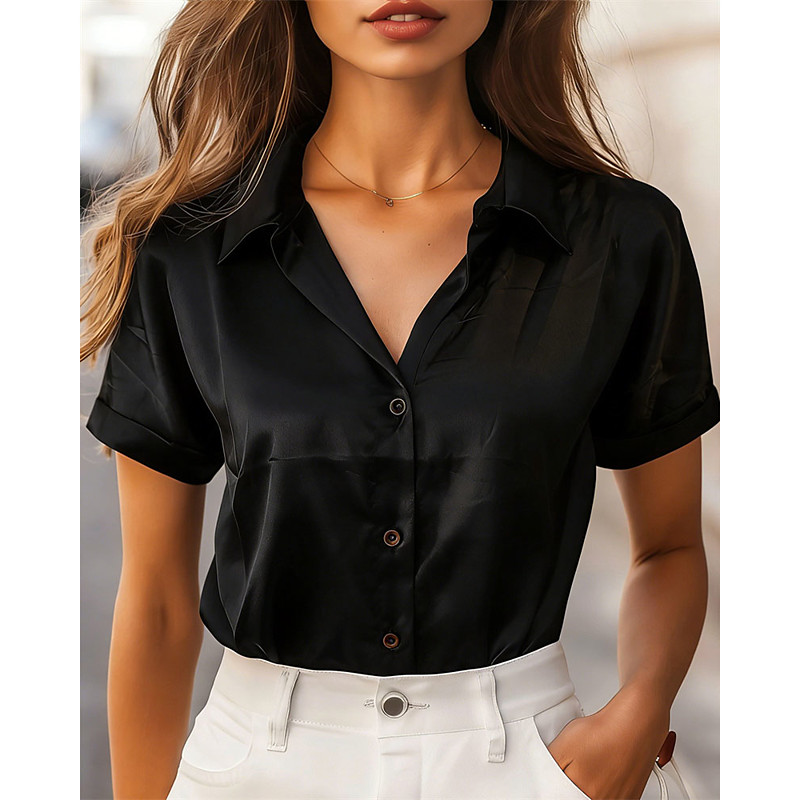 Women's Shirt Elegant Satin Summer Tops Solid Color Plain Elegant Vintage Daily Short Sleeve Shirt Collar Regular Tops Daily Work Holiday Ruched Patchwork Buttons Blue Black White Champagne Pink