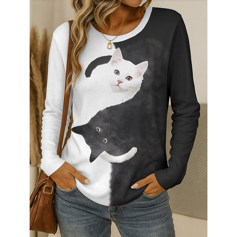 Women's T shirt Crew Neck Long Sleeve Tunic Graphic Animal Cat Vintage Stylish Classic Round Neck Regular Tops Daily Weekend Print Black and White Black White Yellow Pink Spring Fall
