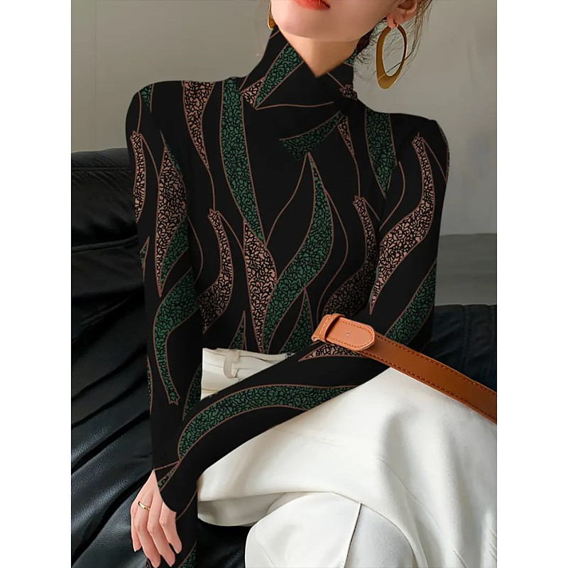 Women's T Shirt Graphic Abstract Elegant Vintage Stylish Long Sleeve High Neck Asymmetric Neck Regular Tops Daily Print Tiered Black and White Pink Brown Spring Fall Winter