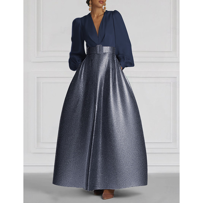 A-Line Floor Length Evening Gown Ball Gown Formal Dress Elegant Color Block Silky Long Sleeve V Neck Wedding Formal Pocket Chiffon Satin with Embroidered Flower