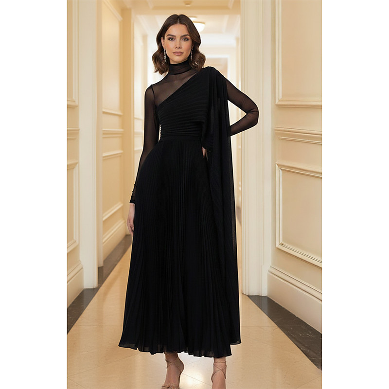 A-Line Floor Length Evening Gown Ball Gown Formal Dress Elegant Glittering Silky Long Sleeve High Neck Wedding Formal Chiffon with Pleats