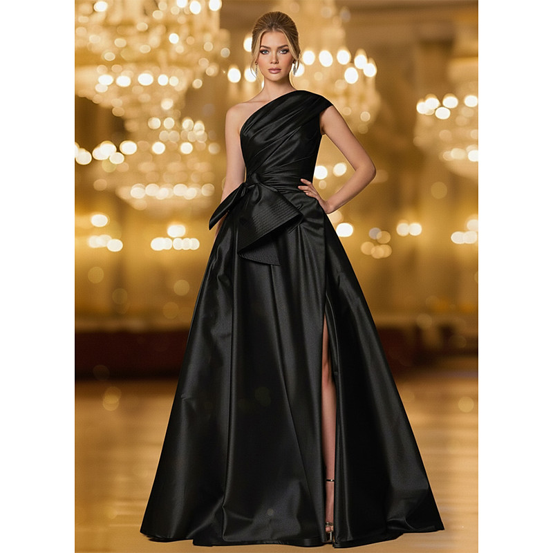 A-Line Floor Length Evening Gown Ball Gown Formal Dress Elegant Glittering Silky Sleeveless One Shoulder Wedding Formal Pocket Stretch Satin with Bow(s) Ruched