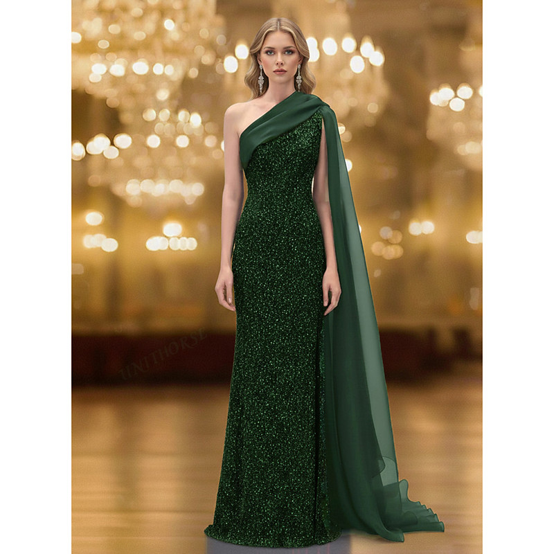 Sheath Column Floor Length Ball Gown with Cape Evening Gown Ball Gown Formal Dress Elegant Glittering Silky Sleeveless One Shoulder Wedding Formal Pocket Satin Sequined with Glitter Shouder Flower