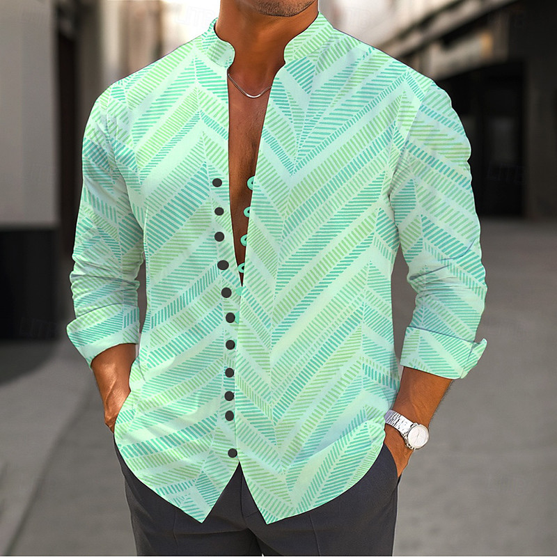 Men's Gradient Waves Shirt Stand Collar Shirt Long Sleeve Casual Vacation Daily Wear Going out Spring Fall Mandarin Collar Band Collar Button-Down Linen Like Shirt Green