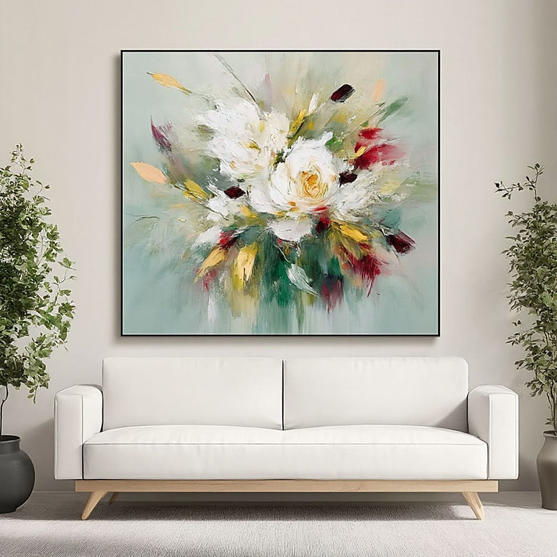 Hand Painted Abstract Flower Oil Painting Vibrant Multicolored Blooms in Vase Textured Art for Living Room Entryway Dining Room