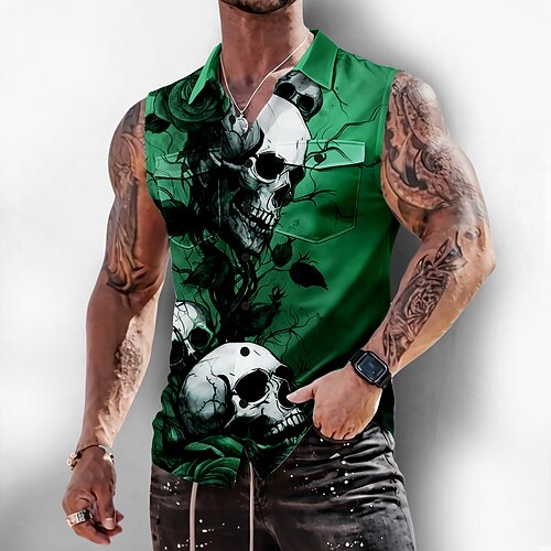 Herren Horror Rose Totenkopfe Hemd Knopfhemd Ärmelloses Shirt Ärmellos Dunkler Gothic-Stil Outdoor Lässig Sommer Frühling Umlegekragen 3D-Druck Zwei Fronttaschen Blau Rote Purpur Grün