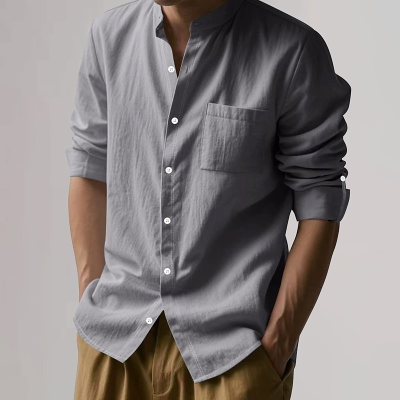 Men's Cotton Linen Shirt Plain Vacation Black White Khaki Dark Gray Long Sleeve Grandad Collar Clothing Apparel Pocket